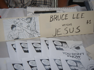 Saturday, June 7th I went with Ryan Beckwith, my buddy who illustrated our joint effort The War In Heaven, to two comics conventions in Manhattan. The Big Apple ComiCon (a. k. a. the Big Apple Art, Toy, and Sci-Fi Expo) was at the Penn Plaza Pavilion on 7th Ave at 33rd St. It was, in the words of the website, ” A fun day for sure [with] throngs of comic, art, sci-fi, and toy fans, celebrities, artists.” I saw throngs. I also saw Storm Troopers, Jawas, and girls with sexy, skimpy outfits and silicone enhanced breats (both drawn and living).