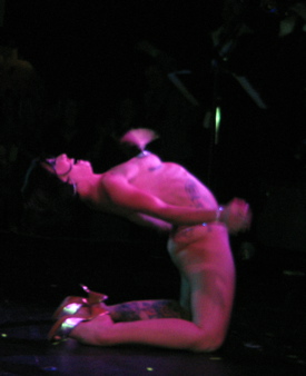 The live band—The Fisherman Burlesque Orchestra—opened with some nice cheesy 60s game show music, and Murray Hill came on to host. Murray is not so much a dyke in drag as a drag in dyke. No, seriously folks, I love him, and I’m pretty sure that everyone who ever wanted to fuck Don Rickles is dying to fuck Murray Hill. No, really, I kid—where else can you find a middle-aged salesman in polyester with a voice as high as Geddy Lee’s? Murray did an opening song—“Show Biz”—with backup dancers, and then, boom, straight to the advertising. But I don’t mind commercials for Secrets in Lace lingerie, especially when it’s presented by the reigning queens of the New York burlesque scene tricked out in pointy 50s brassieres shaking their grind things to “It’s Getting’ Hot in Herre.” Smokin’.
