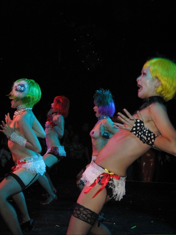 ***Because this is Murasaki Babydoll, a troupe from Japan with four—count ‘em—four Japanese hot-asses. Schoolgirl outfits, neon wigs, shaking it hard as hell, and when the schoolmaster came out they stripped him and spanked him, then stripping themselves down to white fringe bikini tops, then losing those and busting an encore in pasties and tiny fringe bottoms. The Japanese practically corner the market in the ability to mix cute with sexy, and these four are no exception. Fun, wild, exhilarating.