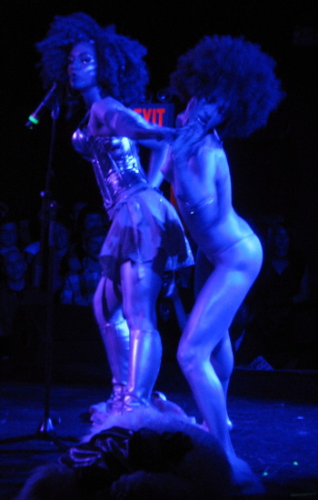 ***Melody Sweets, a New Yorker who was new to me, strutted on in a big white fur coat and a Scary Spice fright wig and impossible platforms, and sang her heart out as a doppelganger basically naked in white-silver Butoh body paint crept up behind her and began undressing her. By the time the strobe lights came on I was already on the edge of an epileptic seizure. Melody can truly sing, the both of them are unbelievably sexy, and their writhing together was like a futuristic advertisement for safe lesbian sex.