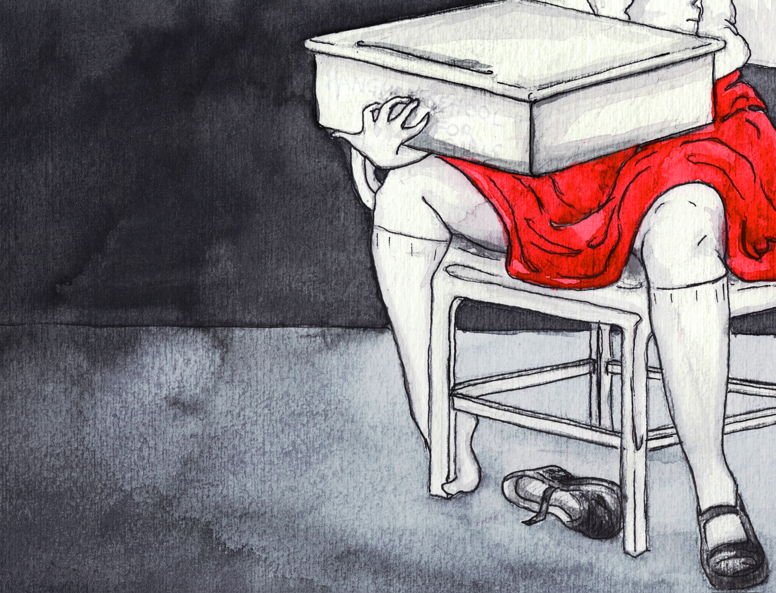 The lights come up, and a group of girls parades into a classroom. Three march in military cadences around their acknowledged queen standing on a desk: Chelsea, whose name evokes the precincts of money and class in both New York and London. They carp in posh English accents, the kind that set my teeth on edge when they aren’t done well. (American actors usually slip into something that sounds like a poor man’s Monty Python.) But the actors keep it together admirably as Chelsea self-consciously plays the Queen of Hearts from Alice in Wonderland to her sycophantic entourage. Then a fifth actor comes on stage, taller than the rest, with a lean and hungry look, but also painfully shy. Alice in Wonderland meets Mean Girls. Queen Chelsea and her court give the new girl the standard test for rank in their disciplined hierarchy: Name?! Hazel. (Rather boring and dowdy – points off.) Family vacation spot?! France. (Also boring, but better than Brighton.) It looks bad for Hazel when she tells the court – without being prompted! – that her family went to France on a cheese tour. Definitely not cool. The hierarchy is settled and the ladies take their desks in order of rank. Hazel, being the lowest, has to take the creepy, ancient, wooden desk in the corner.