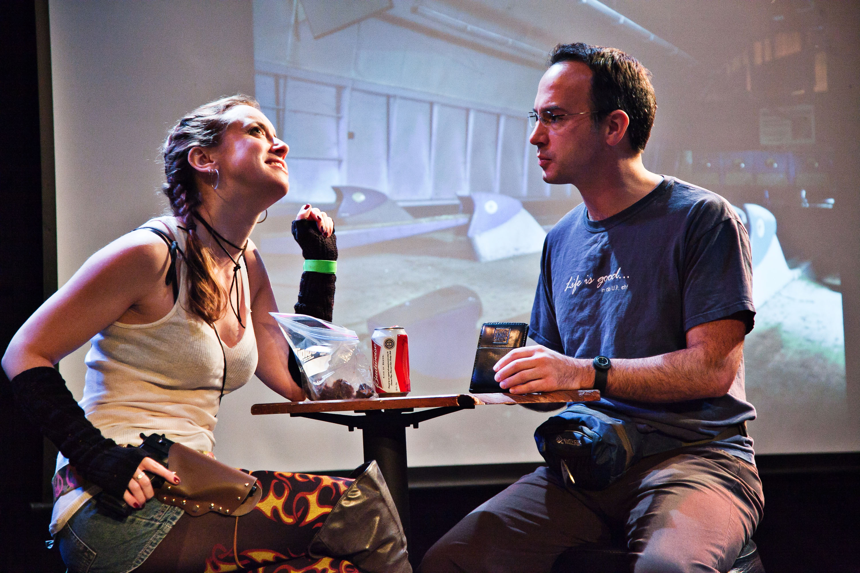 OK, that’s not actually the riddle. None of the zombies in the play ever get high like a cat someone snuck into the all-male freshman dorm so they could blow marijuana smoke in its ears and watch it do the crazy dance. It’s true, the one and only on-stage zombie is treated like a naughty kitty in that it gets the spray bottle when it gets out of line. But in the final analysis, it is the humans’ inability to stay sober that enables the comedy machine to rattle along for two hours. I’m not giving anything away when I say tripping balls on liquid acid is a bad way to prepare for the end of the world.