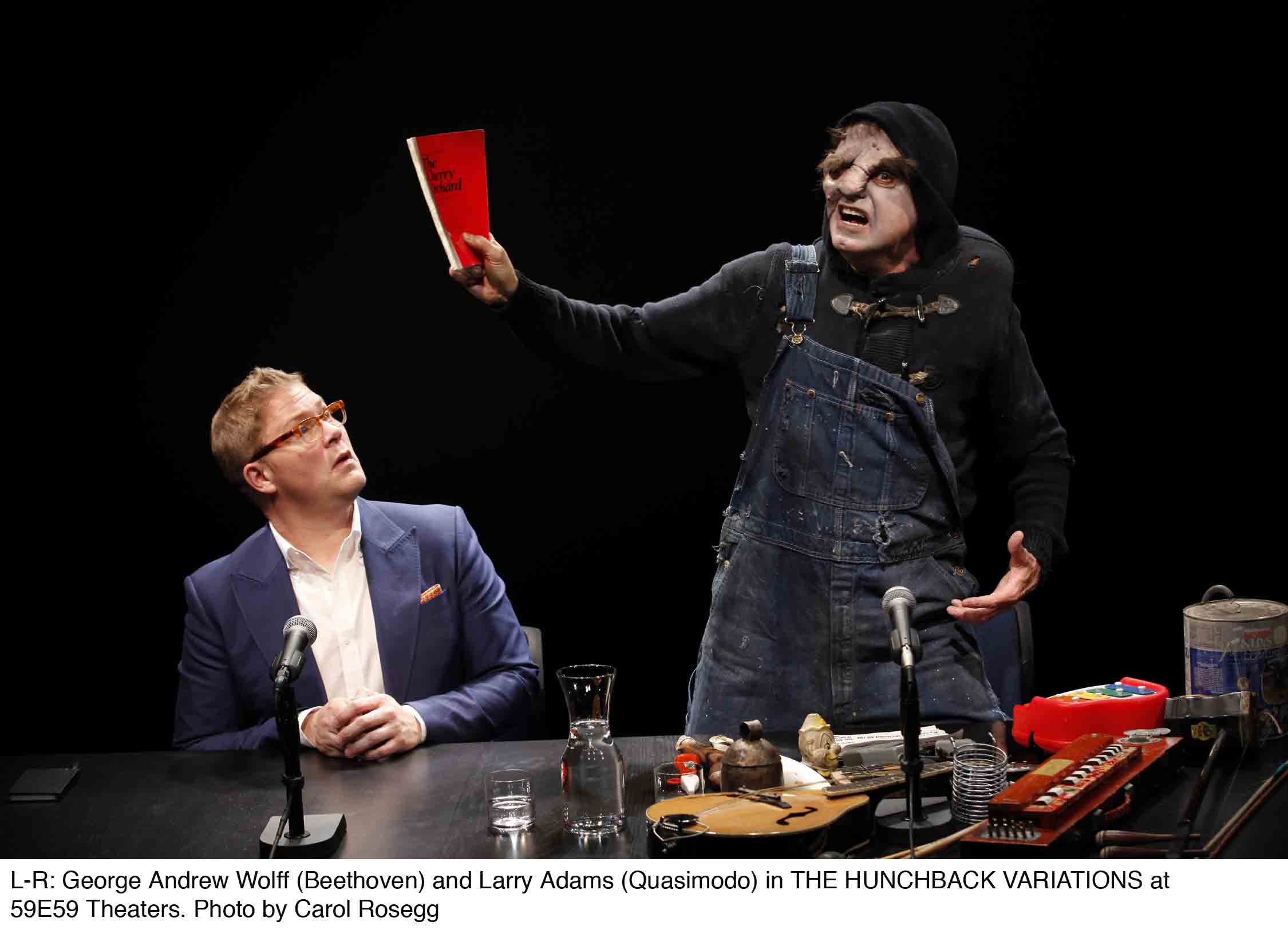 Beethoven and Quasimodo team up to write a musical interpretation of a cryptic stage direction in Anton Chekhov’s play The Cherry Orchard, but both men are deaf and near death, Beethoven is senile, and the project ends in failure. Such is the setup of The Hunchback Variations, based on Mickle Maher’s play with music by Mark Messing, a “chamber opera” that had a successful run in Chicago and opened June 1 at 59E59 Theaters in New York.