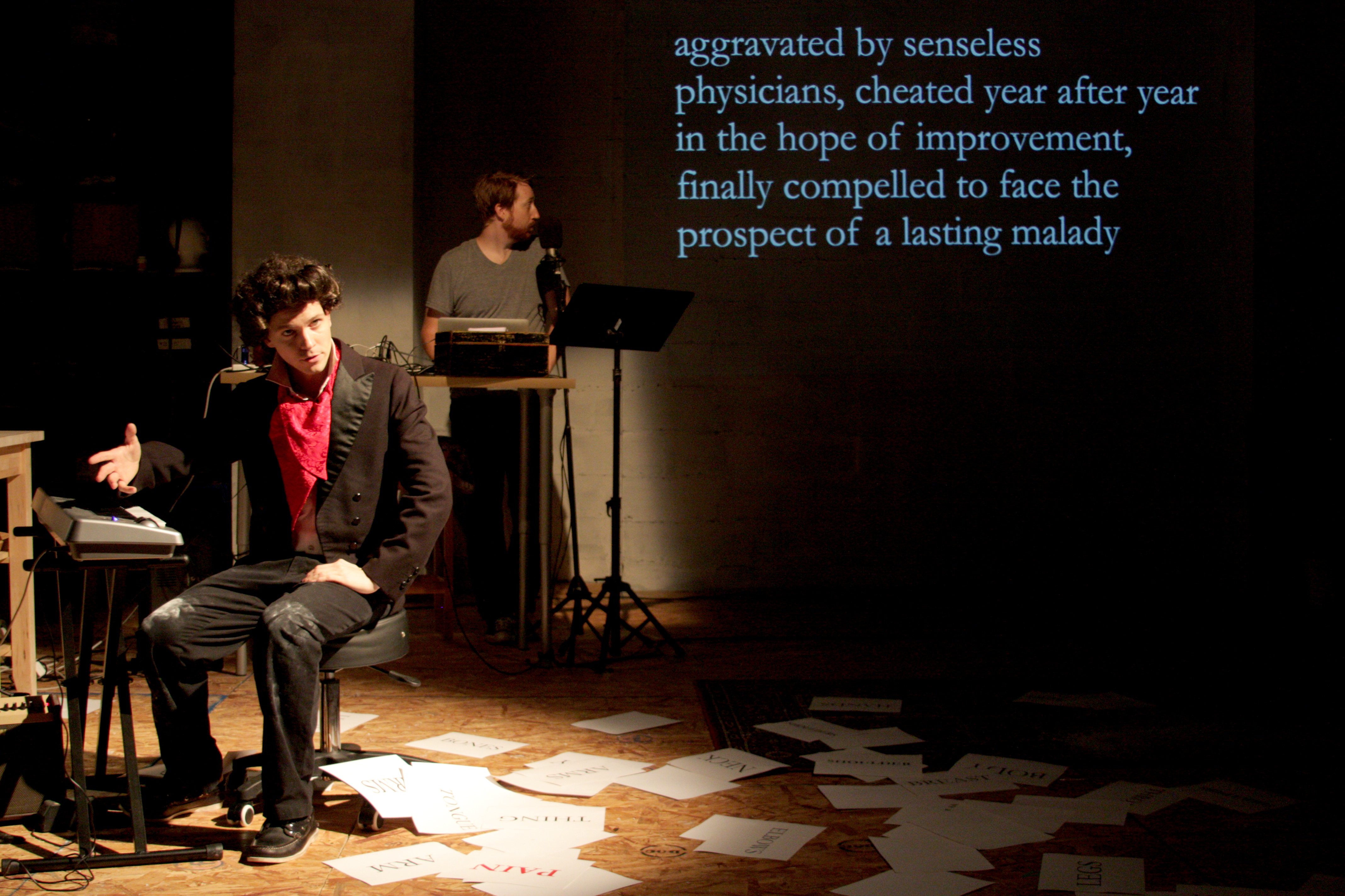 The elaborately named Song of a Convalescent Ayn Rand Giving Thanks to the Godhead (In the Lydian Mode) is a play constructed of twenty-four comic skits, self-consciously styled “variations,” that aspire to something like fugue structure. This is not a happy accident of “negative capability”: the show’s writer, Michael Yates Crowley, constructs the analogy between musical formalism and dramatic form explicitly and self-consciously throughout the performance. That analogy is, in fact, the grounds for the argument of the play, which is that Romantic art only gains transcendence when tempered by philosophical Stoicism.