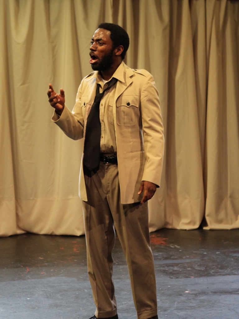 Chinaza Uche plays Othello in this register. Mr. Uche, who has displayed his mercurial talents in roles as diverse as construction worker Brendan Sullivan in Honey Fist, The affable Dr. Peter in Hearts Like Fists, and Demetrius the student in the ten minute play Poor Posturing, rises to Hugo’s hyperbolic vision of the Moor by paradoxically exercising formal constraint for the first four acts of the play, and only letting the majestic rage of the Moor explode onto the stage in the final, tragic movement. Though the other actors keep their American accents, Mr. Uche affects an accent that sounds alien but unplaceable. Dressed in a kakhi uniform, he reminds me of Forest Whitaker playing Idi Amin, which seems to be the best possible choice for the Moor in New York in 2013.