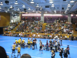 The first great thing I have to say about the New York roller derby scene is this: the Gotham Girls want everyone to come to the party. The pre-party at a bar near the venue was touted on their website — an open invitation — and while I was still patting myself on the back for my uber-super-reporting skills at getting an invite to the after party, I saw the open invitation in the program. You gotta love a bunch of tough girls who want everyone to come and get drunk with them. But here’s the bad news: there’s a reason why you need a “pre” and a “post.” There are no alcoholic beverages served in the basement of Hunter College, and between the metal detectors (read: metal flasks) and the hand searches (read: sniffing water bottles) it’s nigh on impossible to smuggle in booze. And that, my pretties, is the only bad thing I can say about Saturday night’s bout between the Bronx Gridlock and the Queens of Pain.